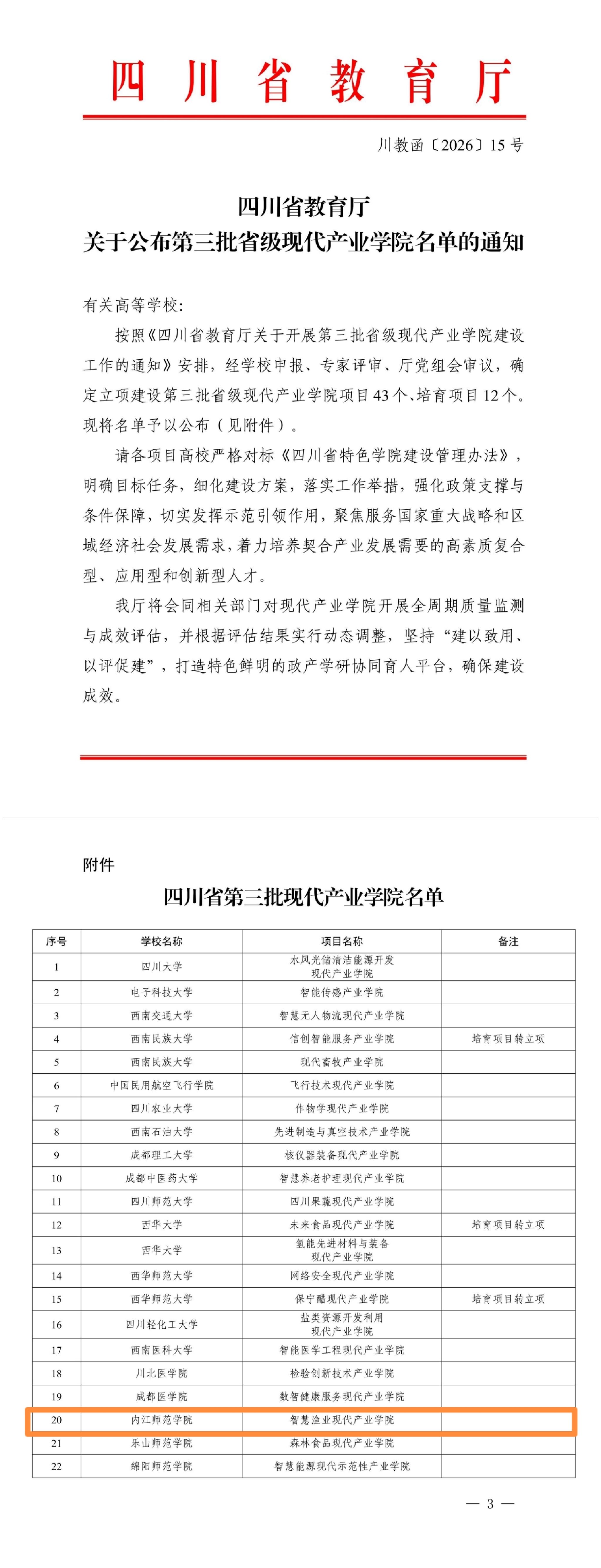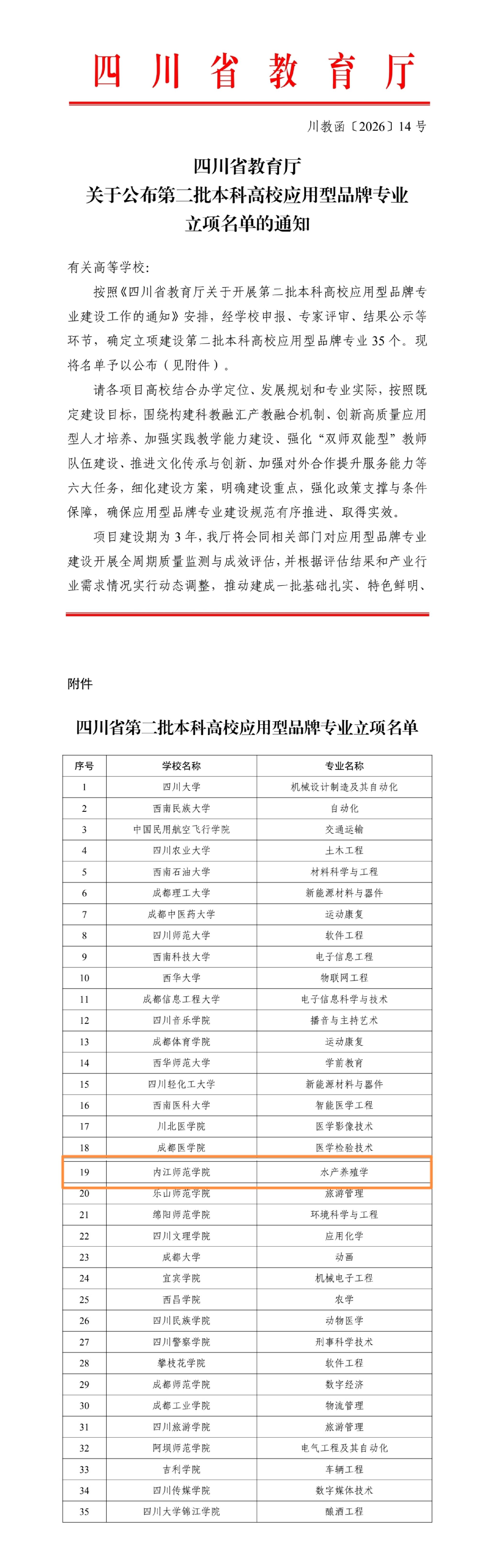 近日,四川省教育厅公布第二批本科高校应用型品牌专业和第三批省级现代产业学院立项名单,我校“水产养殖学”专业获批省级应用型品牌专业,“智慧渔业现代产业学院”入选省级现代产业学院建设名单,这标志着学校在深化产教融合、服务区域产业发展方面取得重要进展。